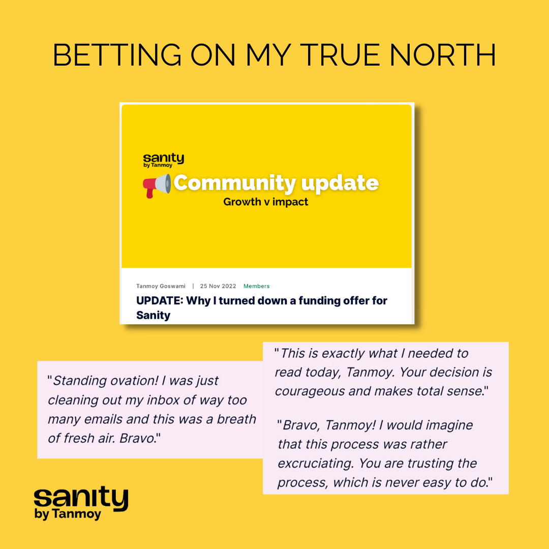 It's those values that led me to decline a funding offer for Sanity this year. Thank you for the dozens of messages you have sent me proving that I did the right thing, even though it may not be considered a model decision for anyone seeking to build a media empire.