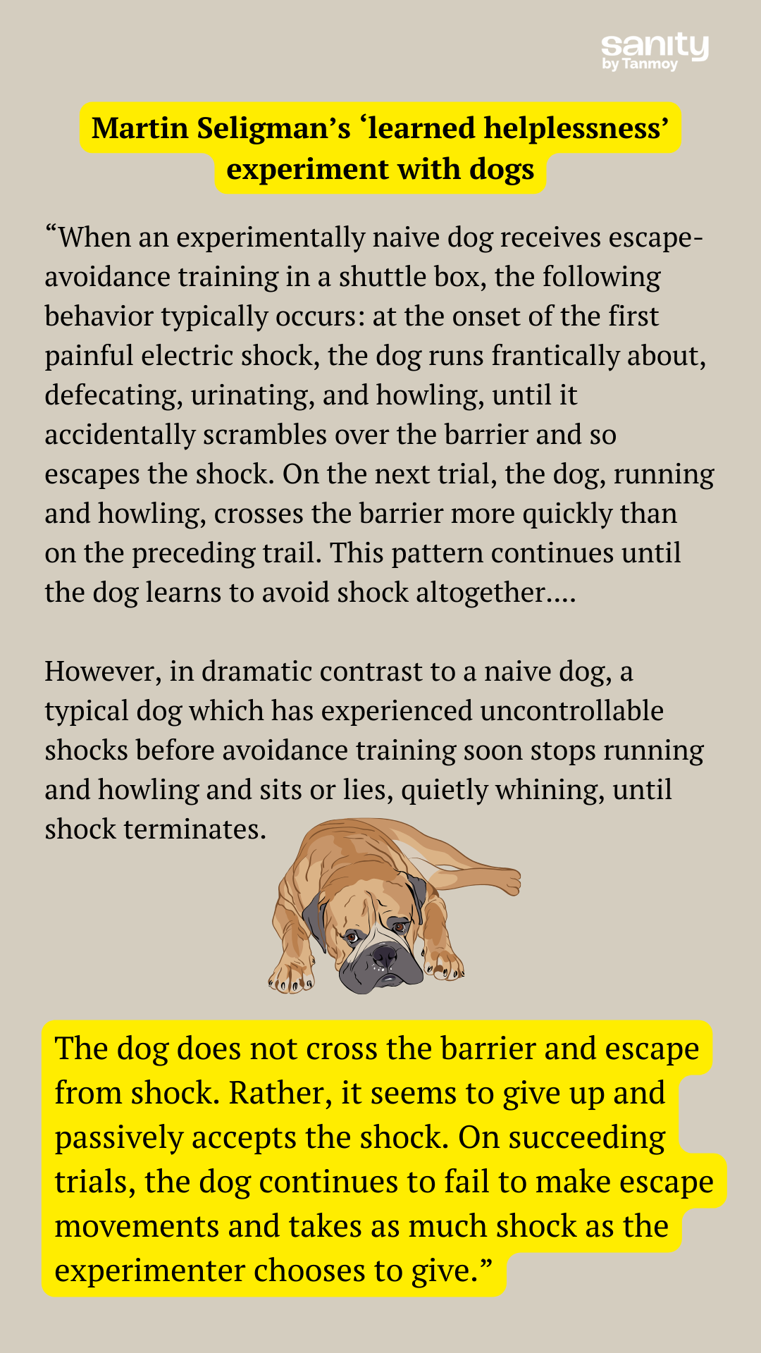 Some half a century ago, psychologist Martin Seligman (whose school of 'positive psychology' I have problems with, but we won't go into that today) showed in an experiment that dogs who were given electric shocks that they had no way of avoiding failed to take protective action during subsequent shocks – even if they were presented a way to escape or avoid the shocks. On the other hand, dogs who had not received unavoidable shocks immediately took action during future shocks.