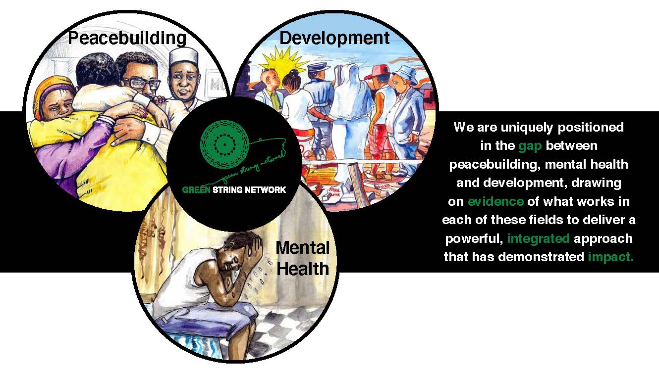 Five years ago, I founded the Green String Network in Kenya. Our vision is to support local organisations to develop and design healing-centred peacebuilding programmes across the region, including in Somalia, Ethiopia, South Sudan, and Kenya. We use storytelling, watercolour illustrations, and embodied practices to help people articulate the violence, abuse, and neglect they have endured.